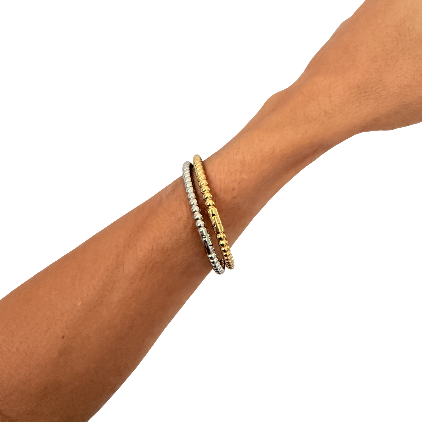 The smooth, hinged closure ensures a comfortable and secure fit, while the unique beaded texture adds just the right amount of shine and dimension.