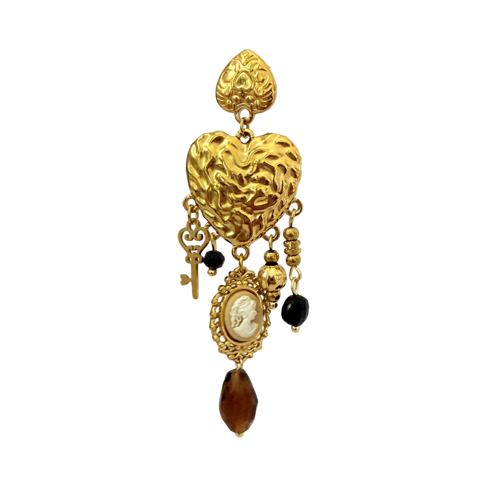 - Design Elements: Textured gold hearts, vintage-style keys, black and brown beads, cameo-inspired oval medallions, faceted teardrop bead
